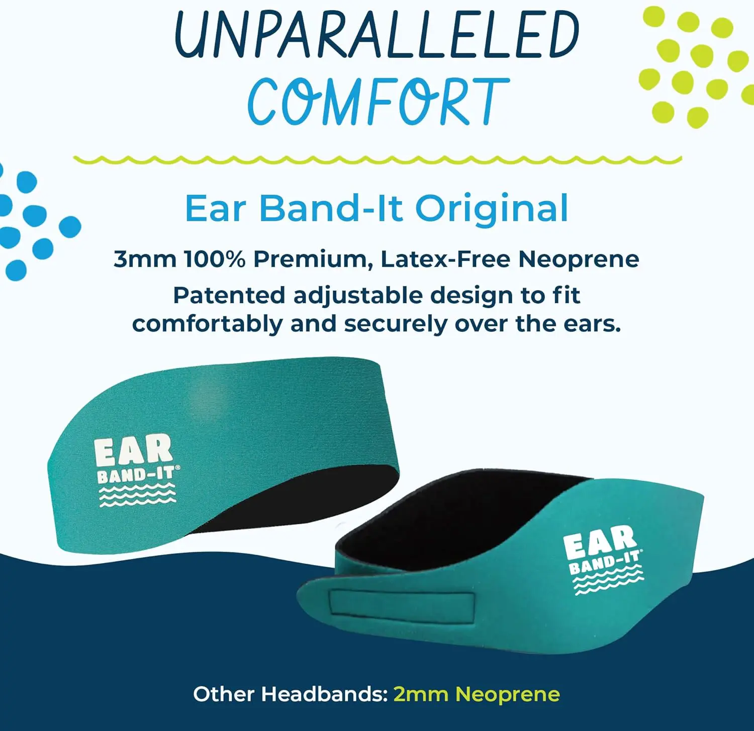 The Ear Band-It is an original swimmers headband made from durable 3 mm neoprene fabric. This comfortable headband was designed by an ENT doctor to keep swimming earplugs, such as Putty Buddies, securely in place during water activities both above and below water. It is ideal for those who have tubes in their eardrums. Additionally, the Ear Band-It is highly suitable for keeping ears and hearing aids dry when the head remains above water. The headband features an adjustable closure for a perfect fit.