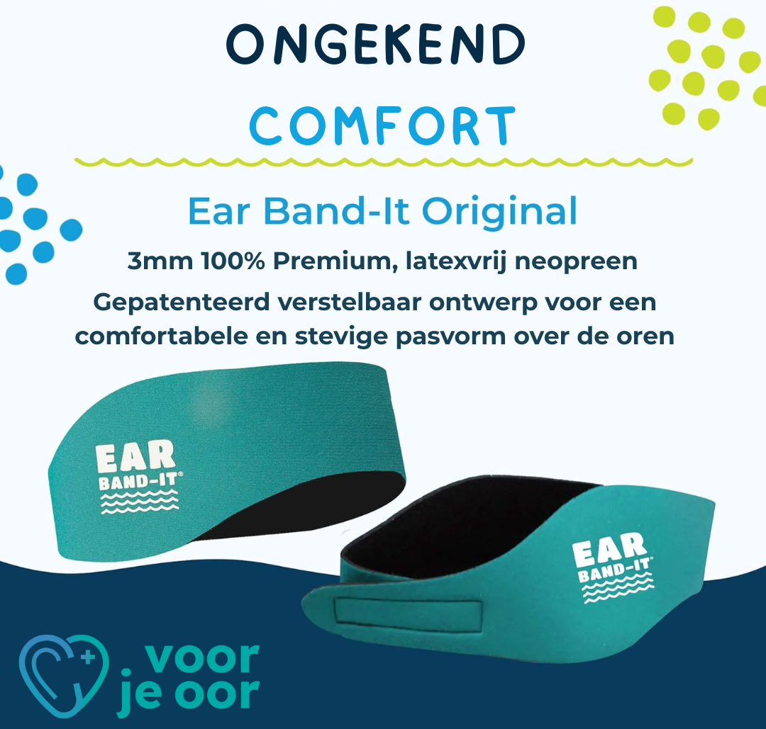 De Ear Band-It is een originele zwemmershoofdband gemaakt van een duurzame 3 mm neopreen materiaal. Deze comfortabele zwemhoofdband is ontworpen door een KNO-arts om zwemoordopjes, zoals Putty Buddies, op hun plaats te houden tijdens wateractiviteiten voor zowel boven als onder water. Ideaal wanneer iemand buisjes in het trommelvlies heeft. Daarnaast is de Ear Band-It uitermate geschikt om oren en gehoorapparaten watervrij te houden wanneer het hoofd boven water blijft. De zwemhoofdband heeft een verstelbare sluiting voor een perfecte pasvorm.